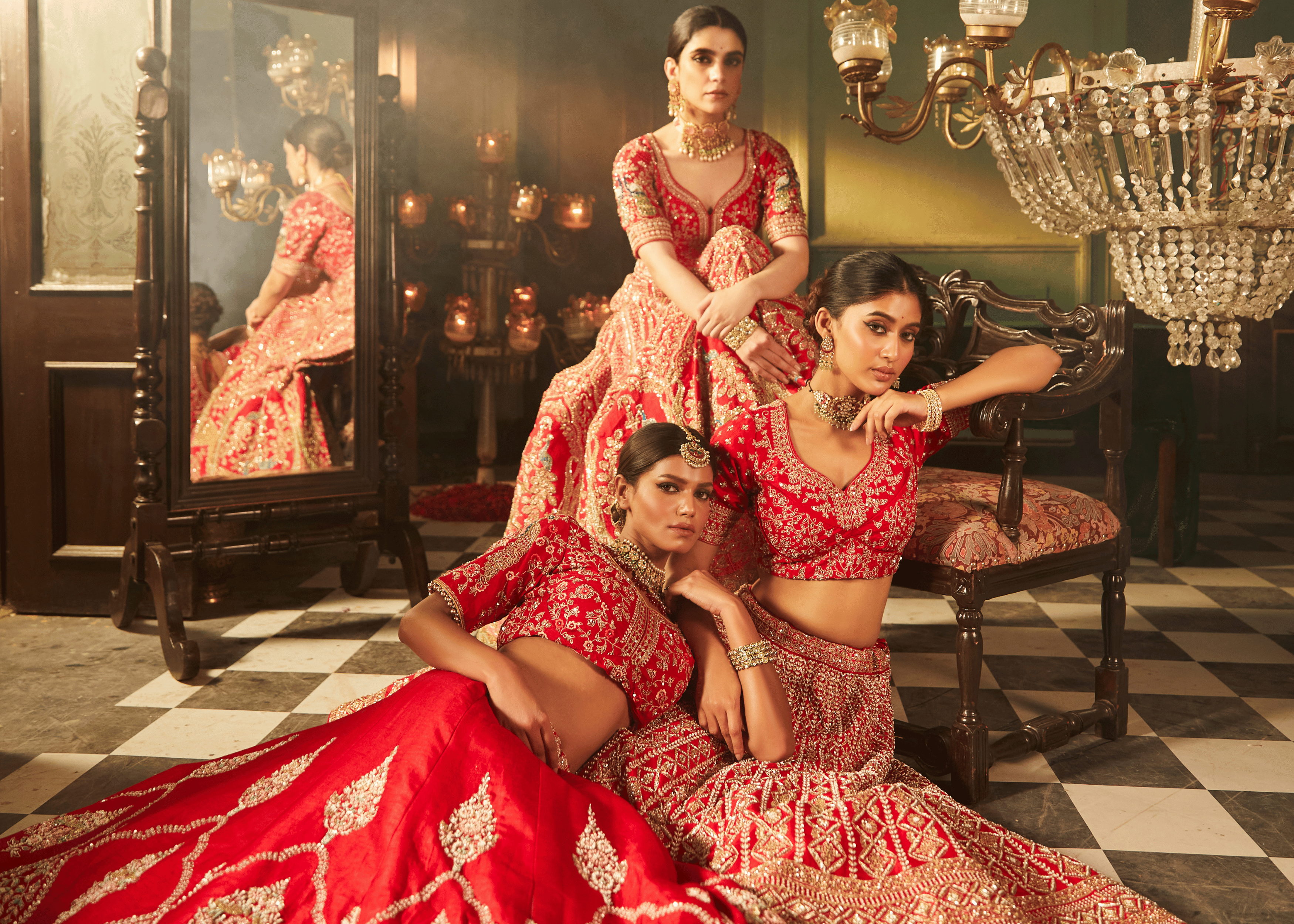 Within this curated collection, you will find an array of bridal trousseau pieces, from sarees to lehengas and gowns, all highlighting the allure of bridal red.